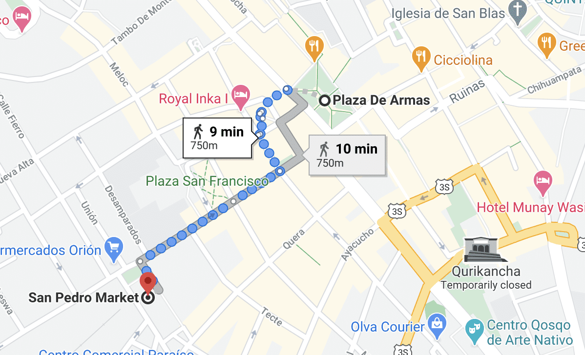 The San Pedro market is located very near to the center of Cusco, just a few blocks and a 10 minute walking distance from the main square or if you prefer, a 3-5 minute cab ride from your hotel depending on where you are staying.