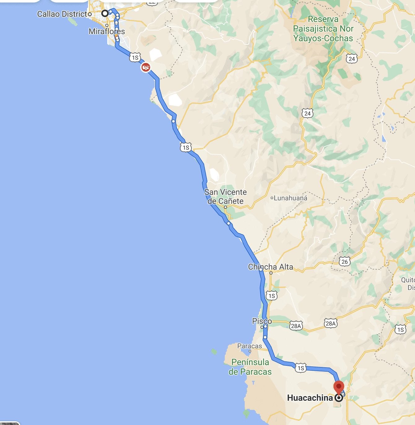 To reach the Huacachina Oasis in Ica we head South from Lima for 4 hours and 15 minutes. We take the route called “Panamericana Sur” until we reach Chincha, then the port of Pisco, and then take the 1S exit to Huacachina. The ride is very straightforward as you can see from the map of Lima to Huacachina above.